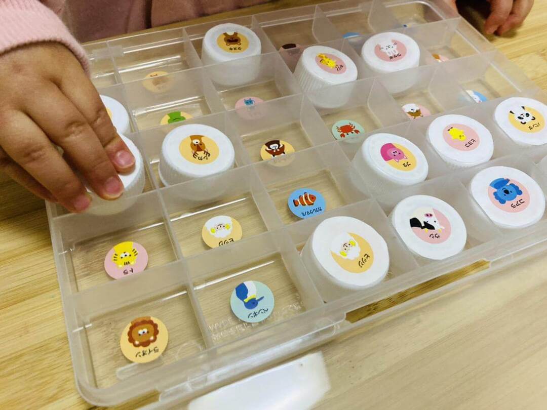 作り方はとっても簡単!ペットボトルのふたにシールを貼り、同じ絵柄のシールを仕切りつきケースのそれぞれのマスにも貼っていくだけです。