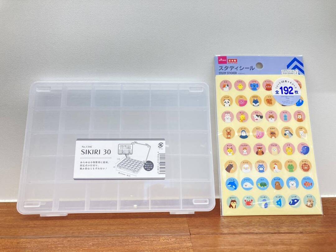 用意する材料は、100均で手に入る仕切りつきのケースとイラスト入りの丸型シール、そしてペットボトルのふたです。今回は、ダイソーで「SIKIRI30」という30に仕切られたケースと娘が好きそうなかわいい動物が描かれたシールを購入しました。