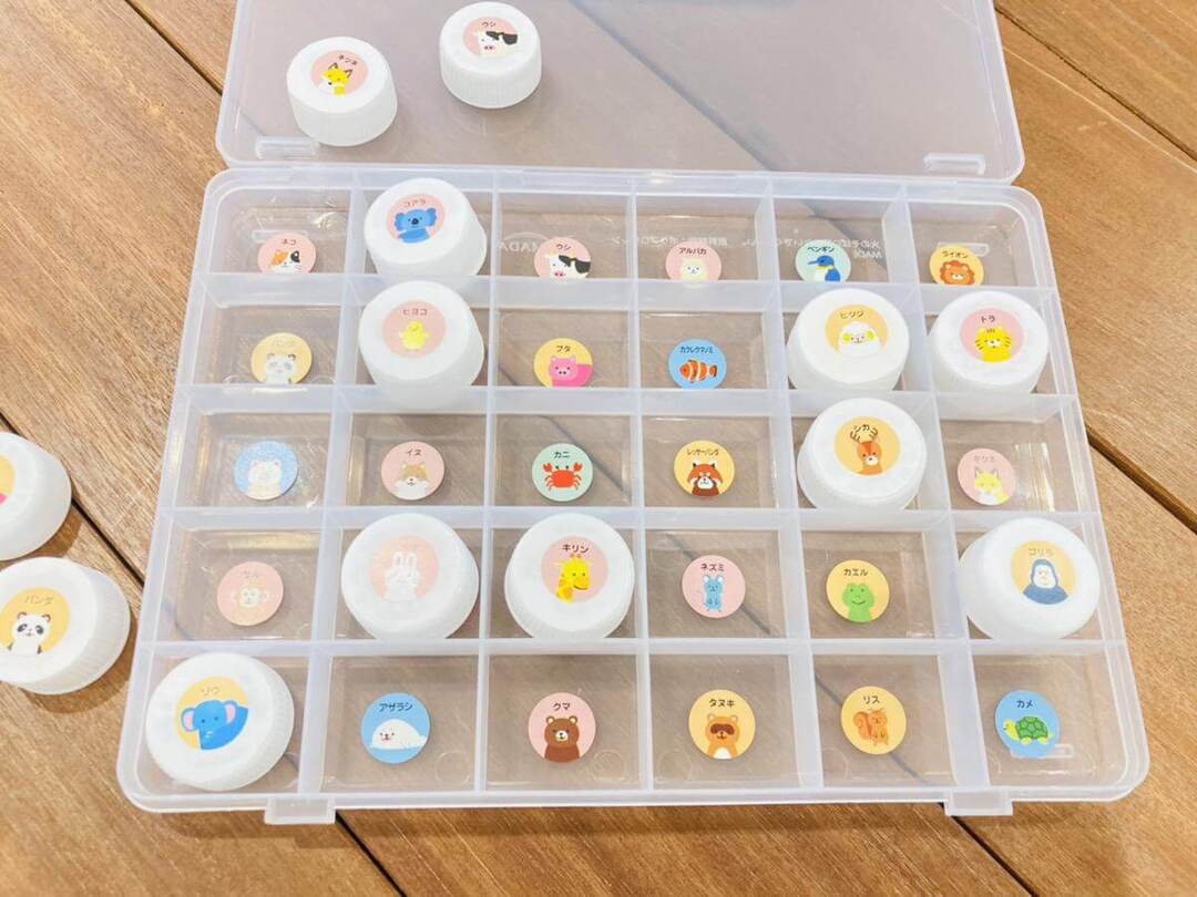 仕切りケースはペットボトルのふたが入るサイズかどうか確認してから購入してくださいね。また、シールは同じ柄のものが2つ必要です。子どもが好きなシールを使うことで、やってみたい!楽しそう!という興味につなげていけます。