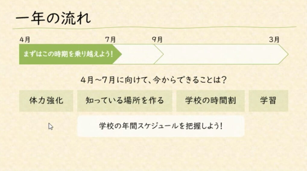まずは具体的な学校生活の中で出てくる不安な要素について解説していきます! 特に入学から夏休みまでの約4ヶ月間にむけて、今からすぐに実践できることをご紹介しますね。