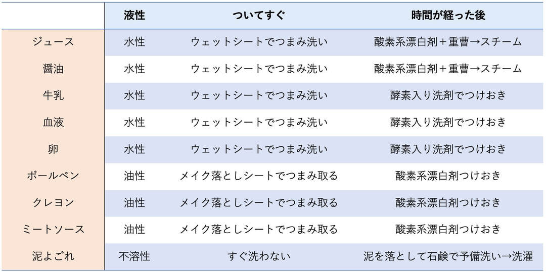 水溶性、油性、不溶性など汚れがついてすぐなら意外と簡単に落とせます。