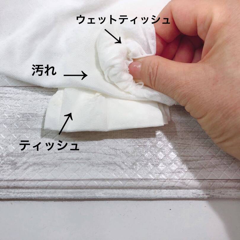 まず汚れの裏側に乾いたティッシュをあてて、表からウェットディッシュ(水で濡らして硬く絞ったティッシュ)で汚れをつまんだり叩き込んだりして取り除きます。