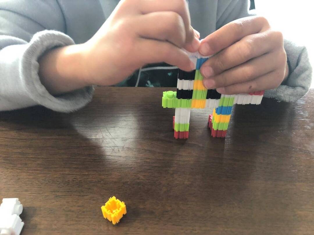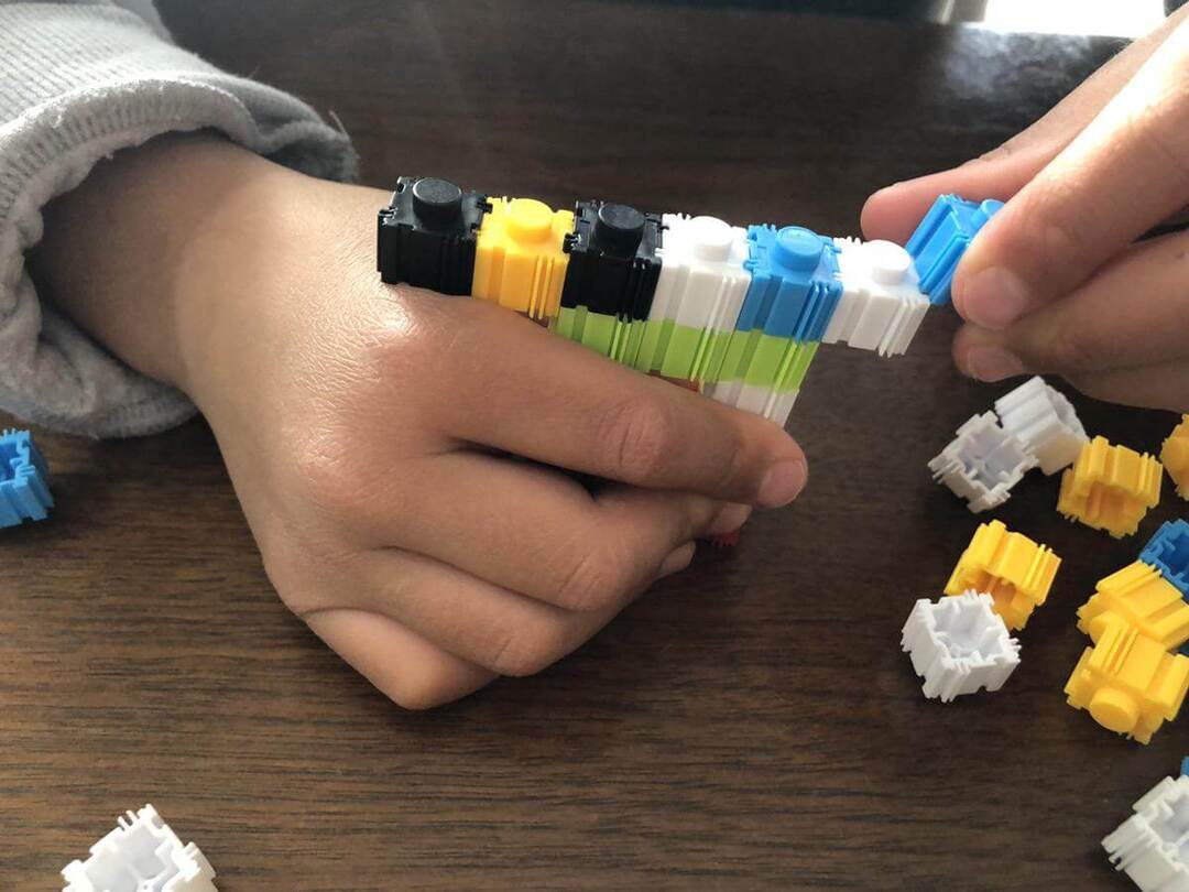 続いて、7歳の息子が「スライドブロック」に挑戦! 何やら考えながら、組み立てています。