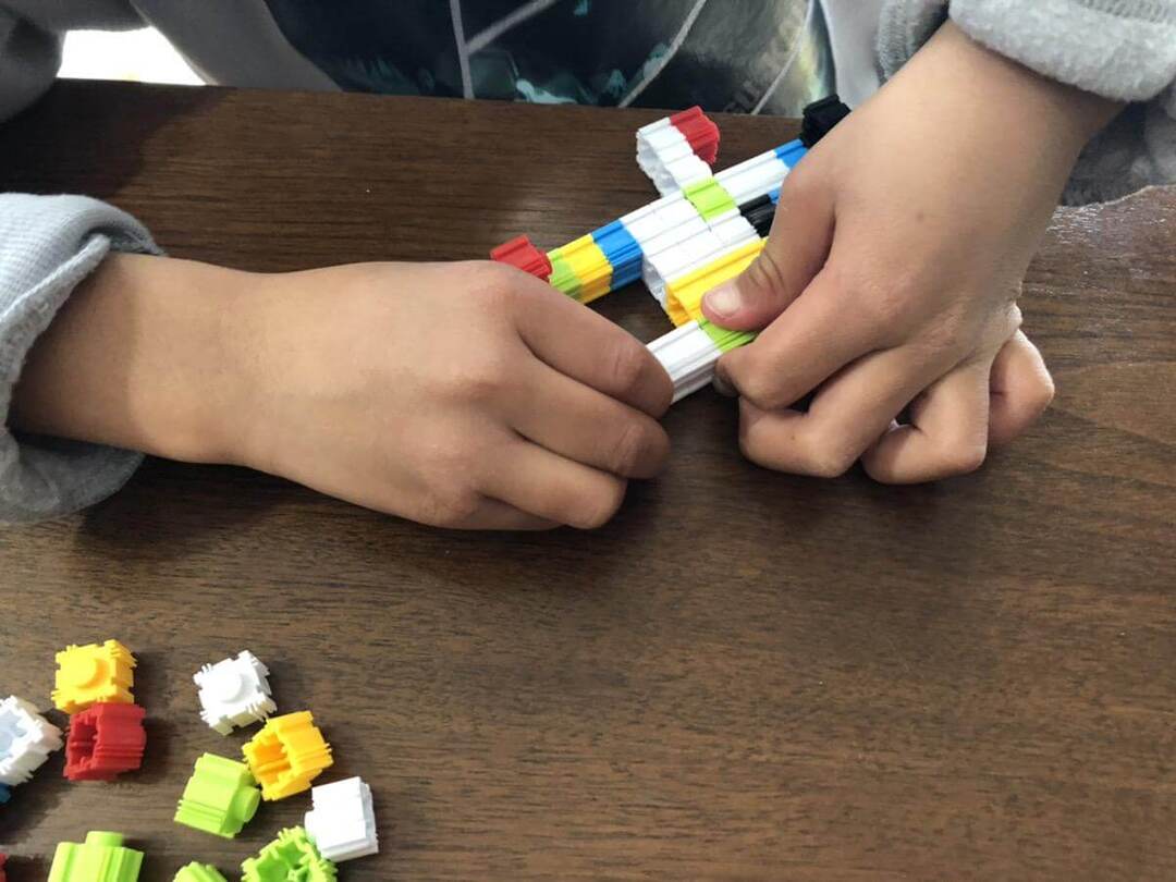 完成すると「かっこいい!!」と大喜び!!共同で作ると、色の組み合わせやつなげ方を相談したり、完成したときには一緒に喜びを味わえたりできて楽しかったです♪