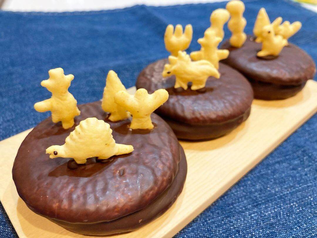 お菓子を上手に組み合わせた見事なコラボ作品がこちら。同じく子どもに人気のお菓子『おっとっと』の恐竜バージョンを軽く穴をあけたチョコパイにのせるだけ!目にはチョコやゴマをつけると生き生きした表情に。