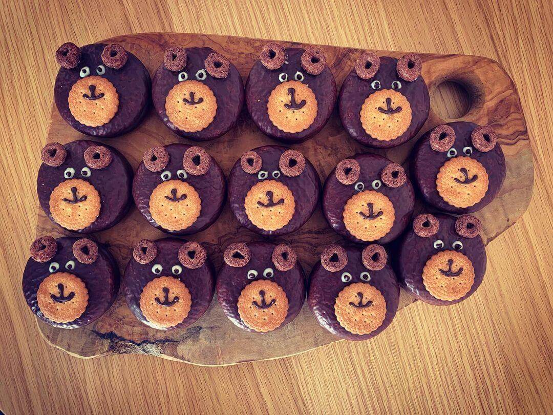 ずらりと並んだかわいいくまさん。耳にはシリアルのチョコワ、口元にはミレービスケットを使っています。チョコペンで目と口を描き込めば、あっという間に完成!