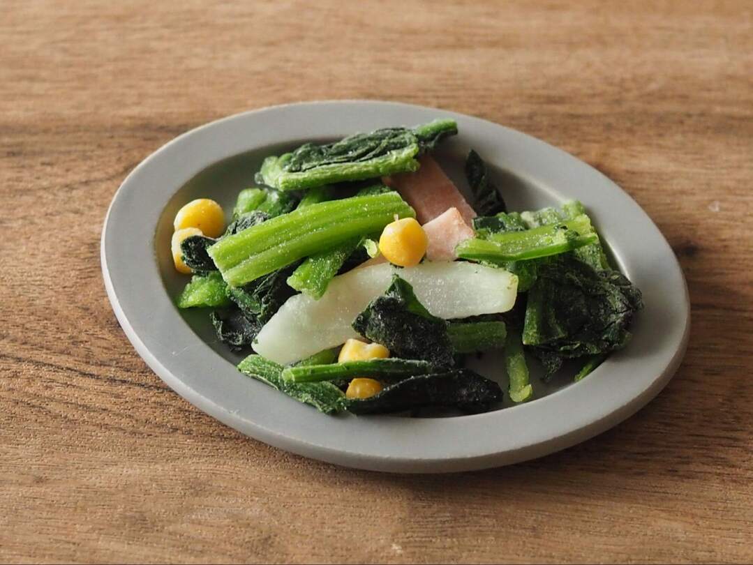 ほうれん草とベーコンのほか、コーン、玉ねぎまで入ってるスグレモノ。バラバラに凍結しているので、使いたい分だけ取り出せます。