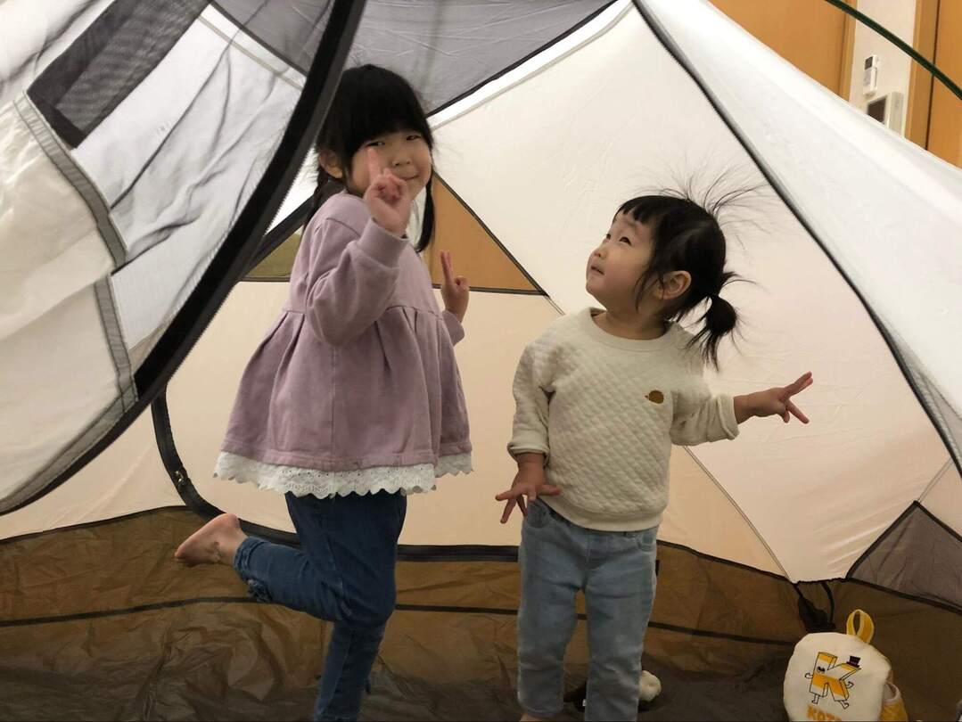 わが家ではここ数年まったく出番のないテントだったので、子どもたちに「テント出そうか」と声をかけると、目がキラキラに☆ テントを組み立てる段階から大はしゃぎでお手伝いしてくれました。 組み立てたテントに入ると、静電気で髪の毛がぶわーっと広がりこれまた大笑い。