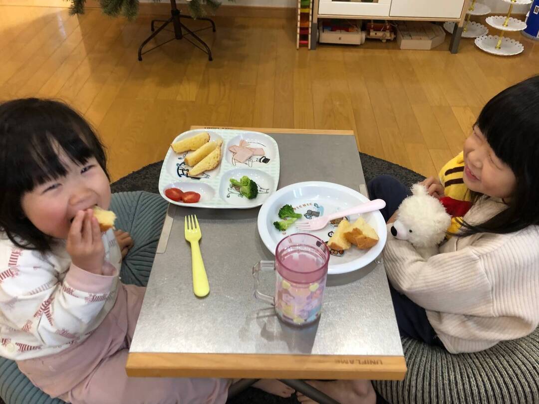 いつも通りの朝食メニューでしたが、小さいテーブルで子どもたちだけで食べる、というシチュエーションがうれしかったようで、ニッコニコでした!