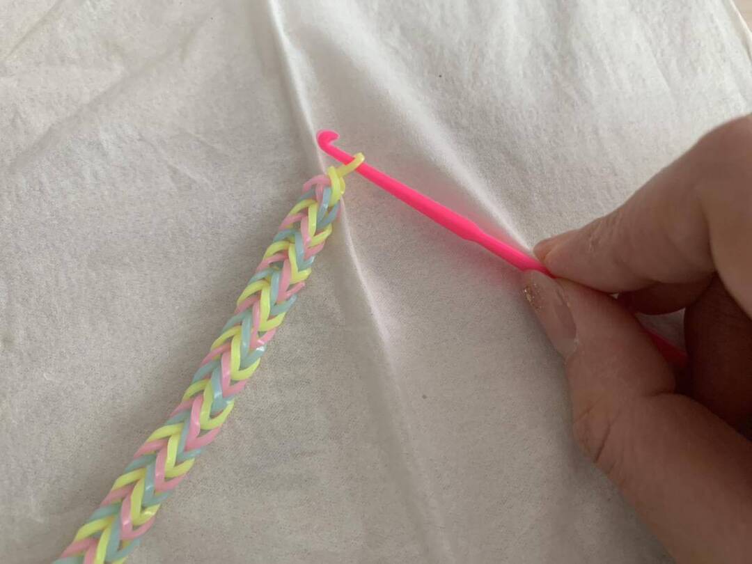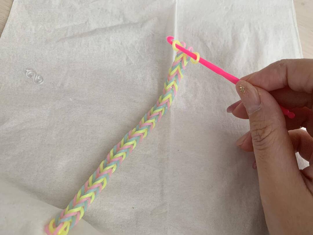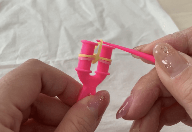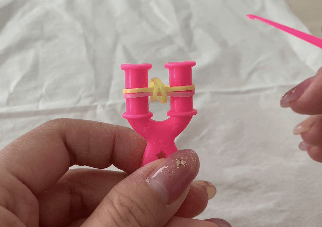 3.あみ棒を使って、一番下の輪ゴムの両サイドを外してY字の内側に入れる。