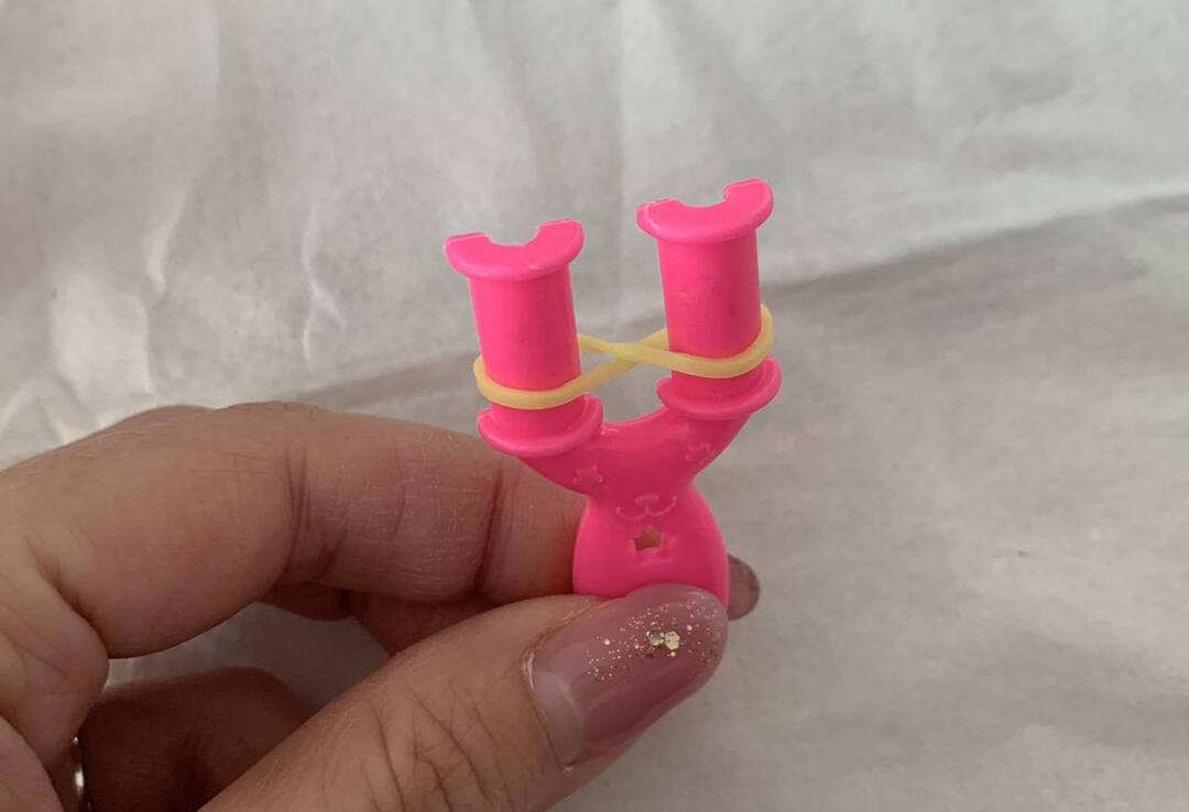 7.輪ゴムの片方をもうひとつの輪ゴムにくぐらせて写真のように結び目を作ります。
