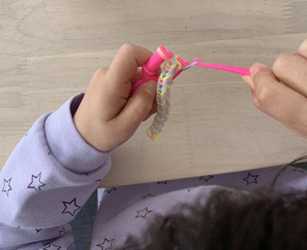 5歳の次女はピンクと水色、黄色の組み合わせのブレスレットが欲しかったようで、姉に注文していました。ある程度まで作ってもらい、最後の仕上げをやらせてもらうことに☆