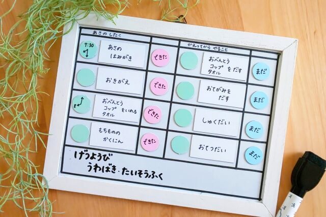 紙やホワイトボードに朝の準備を書き出して一覧にし、見えるところに貼り出します。そしてリストの項目が終わったらチェックをつけたりマグネットを移動したりしてどこまでできたかがわかるようにしてあげましょう。