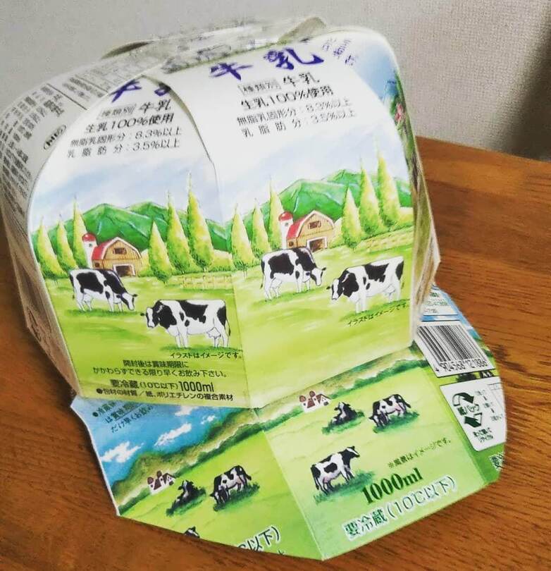 ほのぼのとした牧歌的な絵柄に思わずほっこり。装飾なしでも牛乳パックの柄を活かせば、こんなにステキな帽子ができあがるんですね。