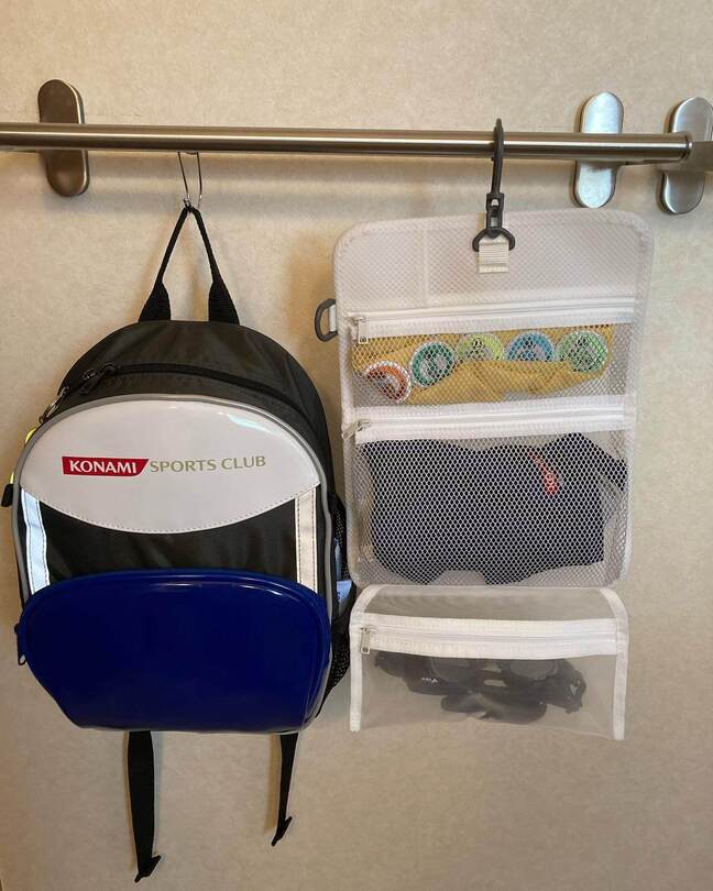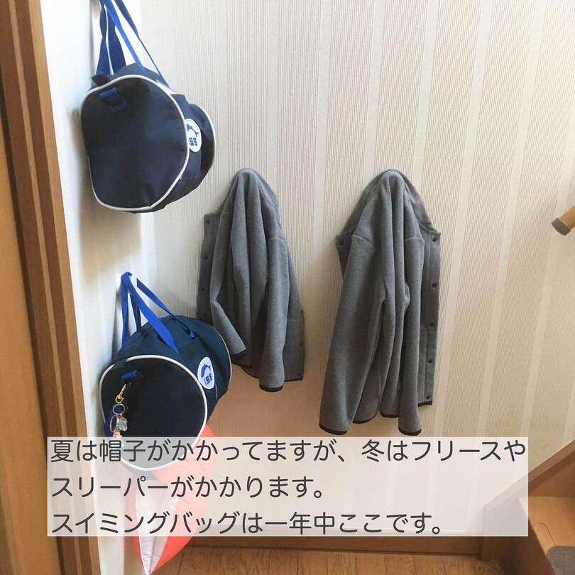 出かける時に必ず通るので、スイミングバッグのほか、夏は帽子、冬はアウターと外出時に必要なものの定位置に。フックでワンアクションの"かける収納"というのもポイントですね。