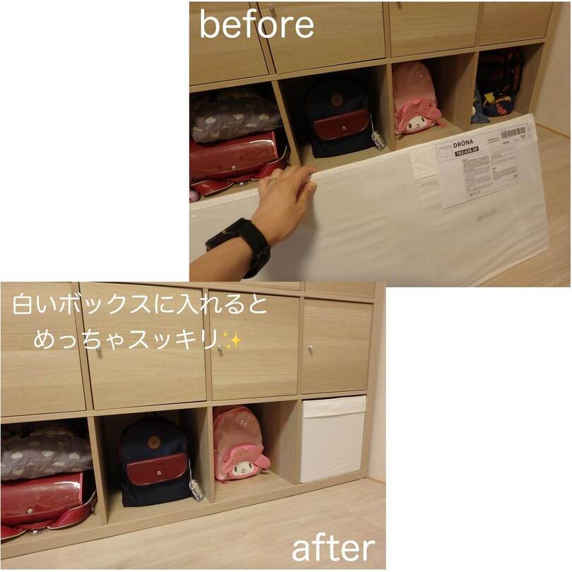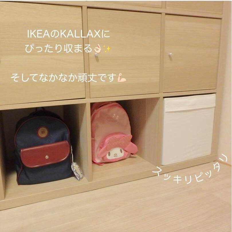 こちらはイケアで人気のシェルフ「KALLAX(カラックス)」を子どものバッグ置き場に。ロッカーのようで、子どもが自分で出し入れしやすいのがポイントですね。