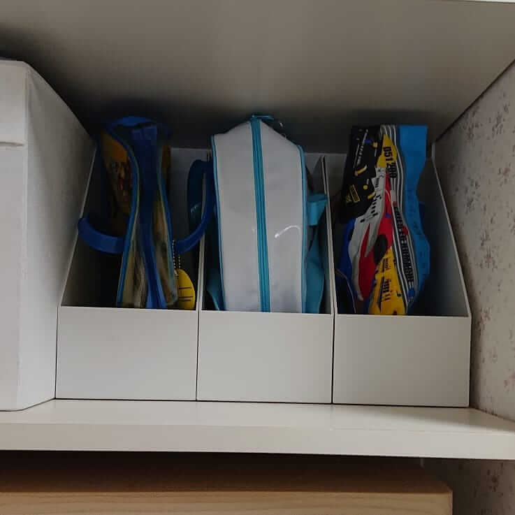 プールバッグはしっかり自立しないものが多いので、立てて置いても倒れてしまいがち。ずっとごちゃついていて、バッグを置くたび、水着などをしまうたびにプチストレスを抱えていたのが、ファイルボックスでスッキリ解決したとのこと。