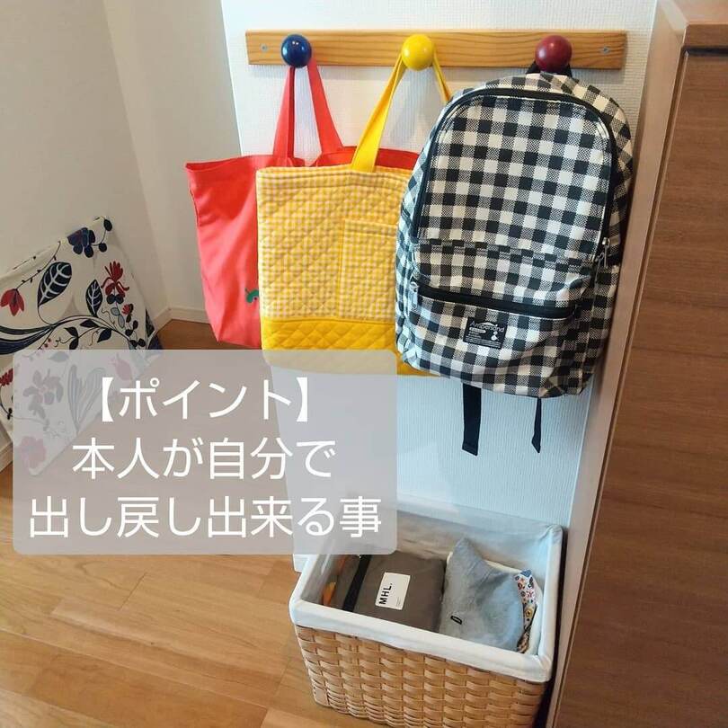 忘れ物防止にもなるし、何より子どもが自分で片付けできる…そんな収納のベストポジションを見つけることが大切、と教えてくれるアイデアでした。
