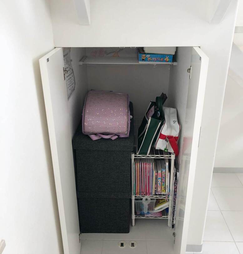 rieさんのお宅では吹き抜けのリビングにある階段下の収納を娘さんのランドセルと、スイミング・そろばんの習い事バッグ置き場に!