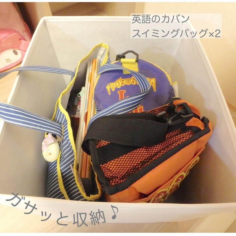 毎日使うわけではない習い事のバッグは、同じくイケアのDRONA(ドローナ)ボックスにIN!スイミングバッグが2つと英語教室のバッグが入っています。