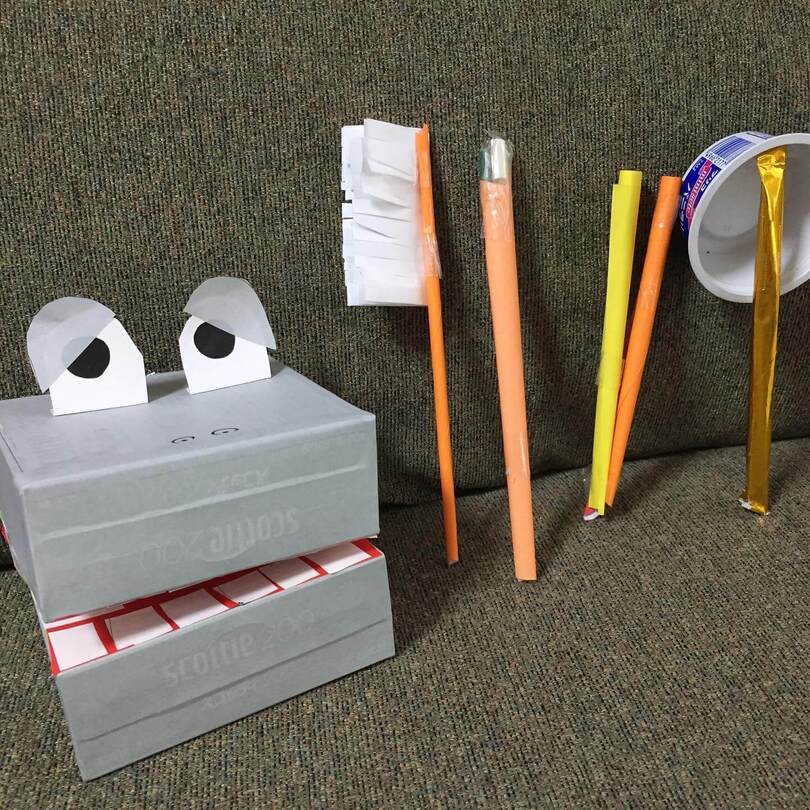 箱ティッシュをカバの大きなお口に見立てて、歯医者さんごっこが楽しめるshinaさんのアイデア。イヤイヤ期や歯みがきや歯医者を嫌がる子どもに、おすすめです。歯医者さんの道具も材料を工夫しながら、作られています。