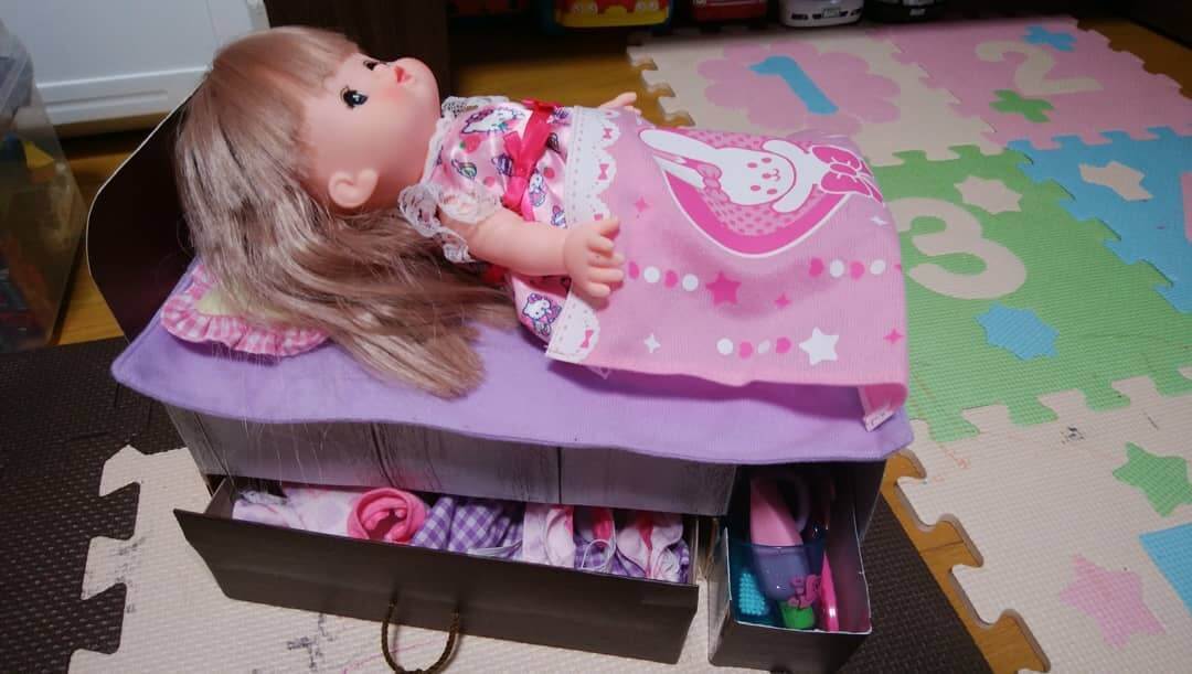 お世話グッズや洋服が充実しているお人形・メルちゃんのベッドを作ったのはkasumiururuさん。娘さんが毎晩、メルちゃんと一緒に寝るようになったので作ってあげたのだそう。