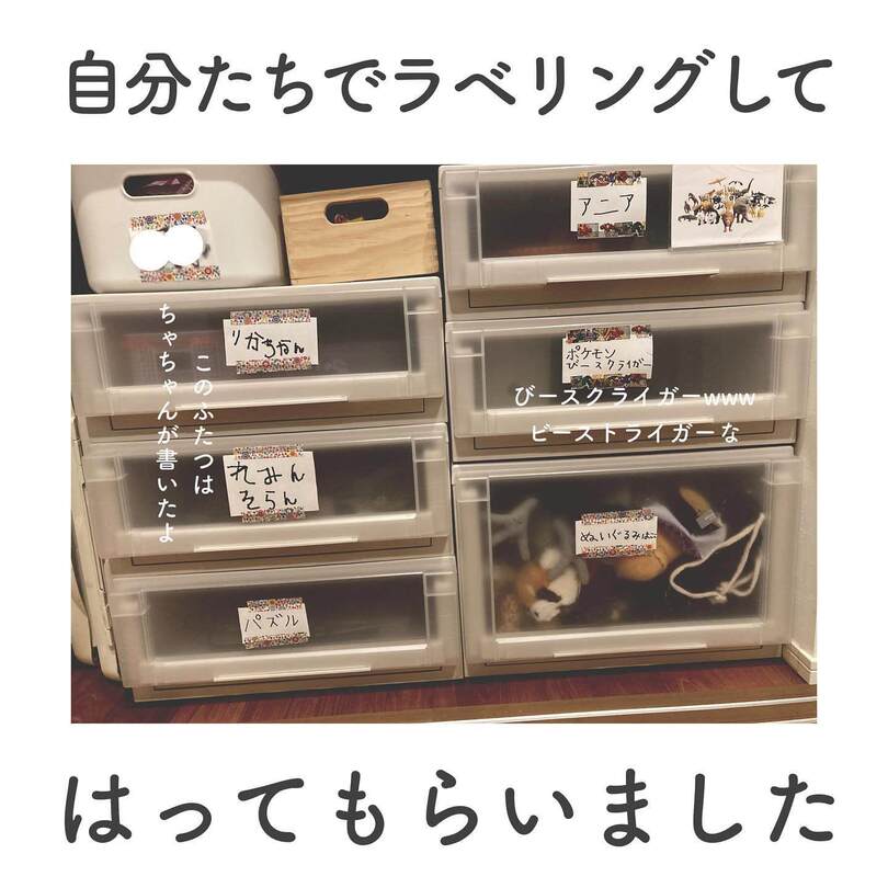 引き出しには、きょうだいそれぞれが書いたラベルを。自分たちで置き場所を決めて、ラベリングすることでお片付けがとたんに子どもにとって"自分ごと"に!
