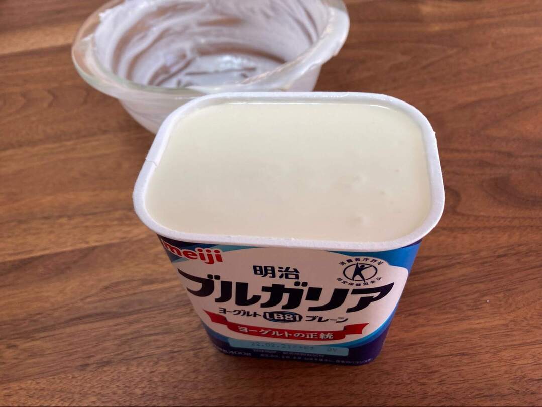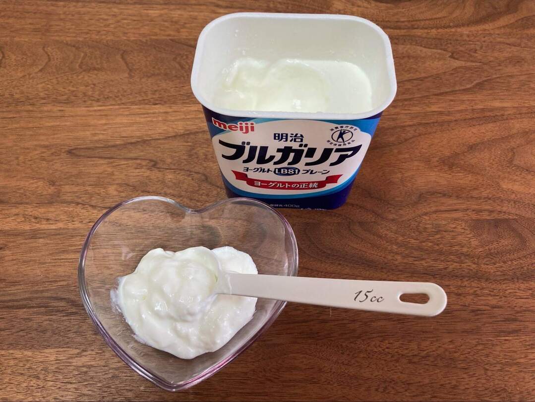 ヨーグルトをパックから大さじ4くらい取り出します。