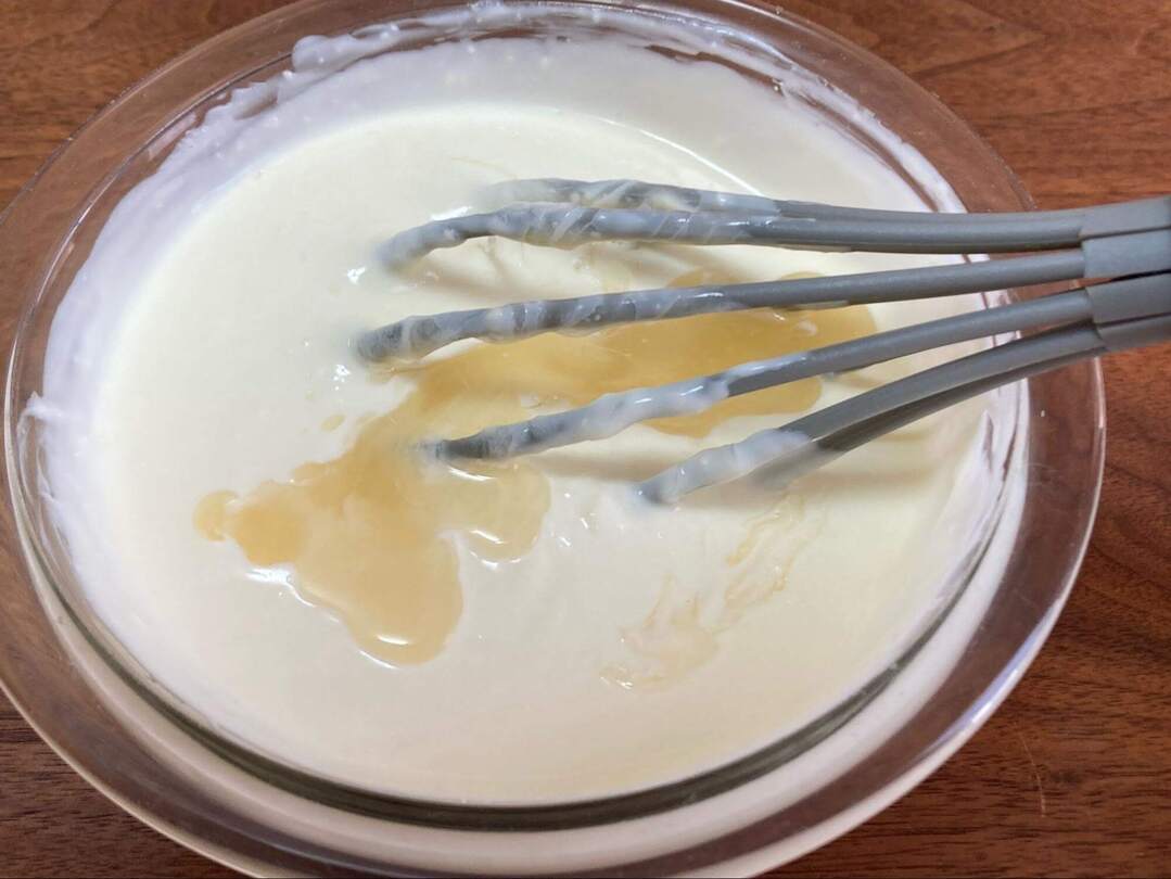 ヨーグルトを2回に分けて入れ、ダマがなくなるようにその都度よく混ぜます。