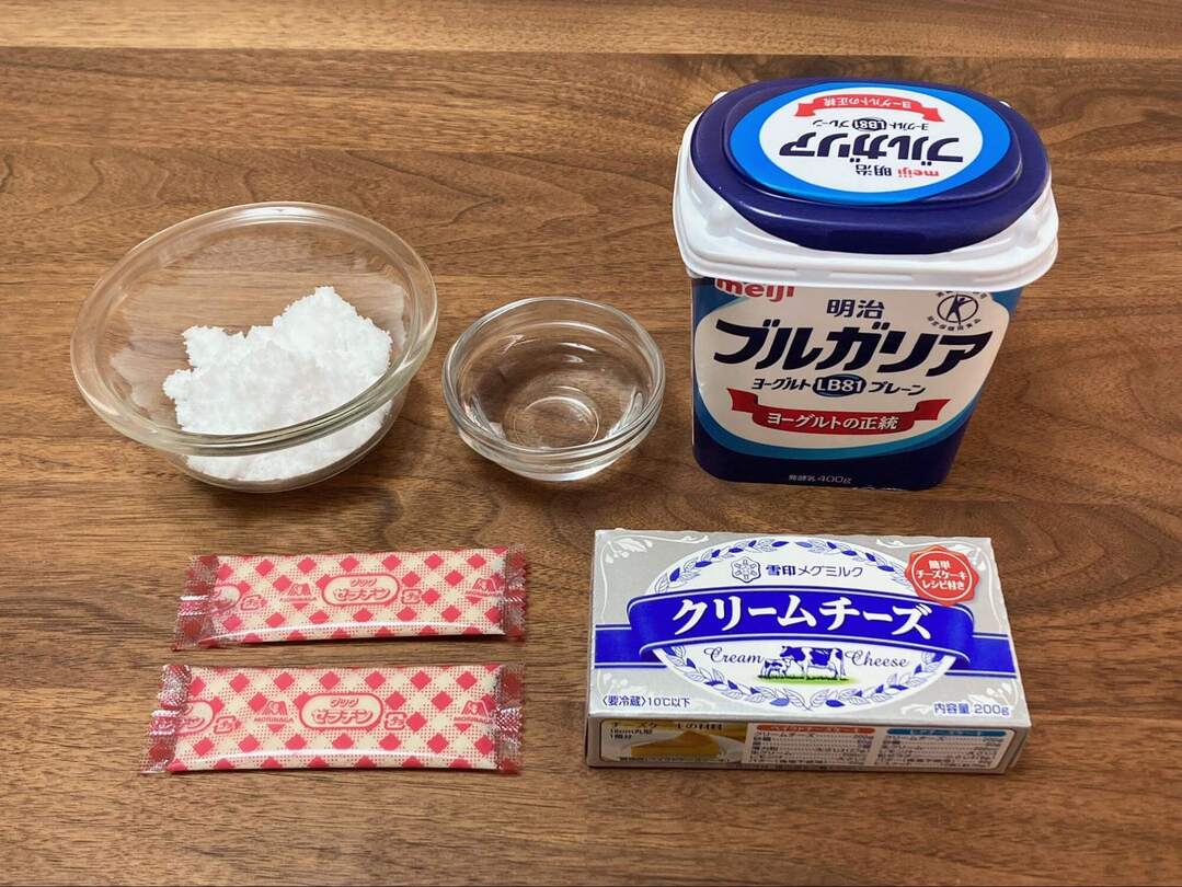 別の耐熱容器に水大さじ3とゼラチンを入れ、電子レンジ600Wで20〜30秒加熱して溶かします。クリームチーズとヨーグルトを混ぜたボウルに加えます。