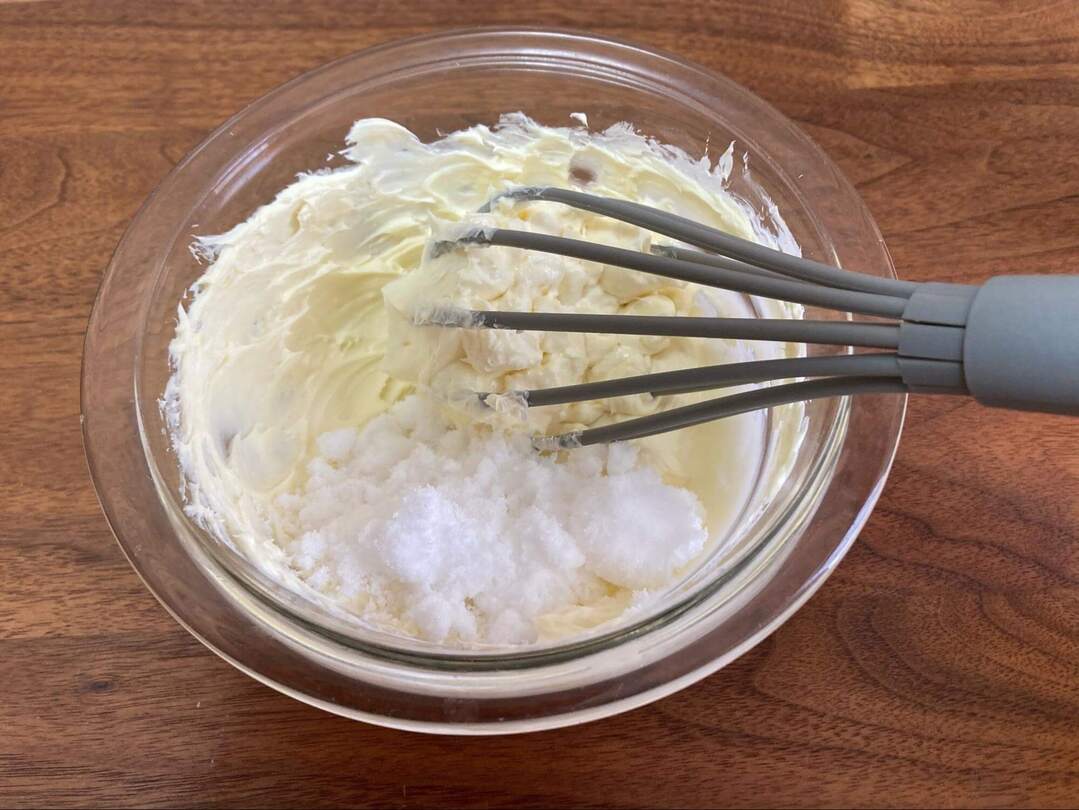 クリームチーズを耐熱容器に入れ、電子レンジ600Wで30秒〜1分加熱して柔らかくします。泡立て器でクリーム状になるまで混ぜ、砂糖を加えてさらに混ぜます。