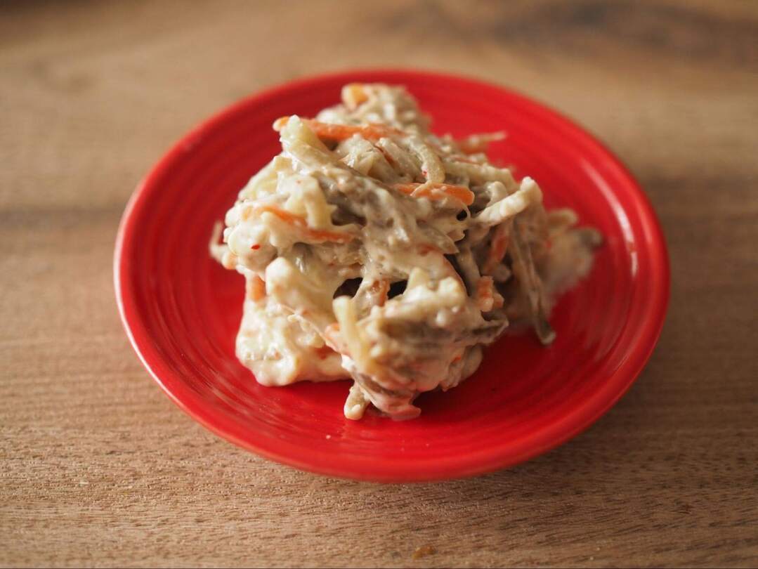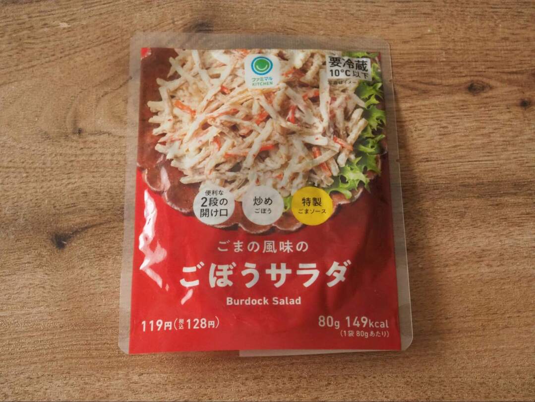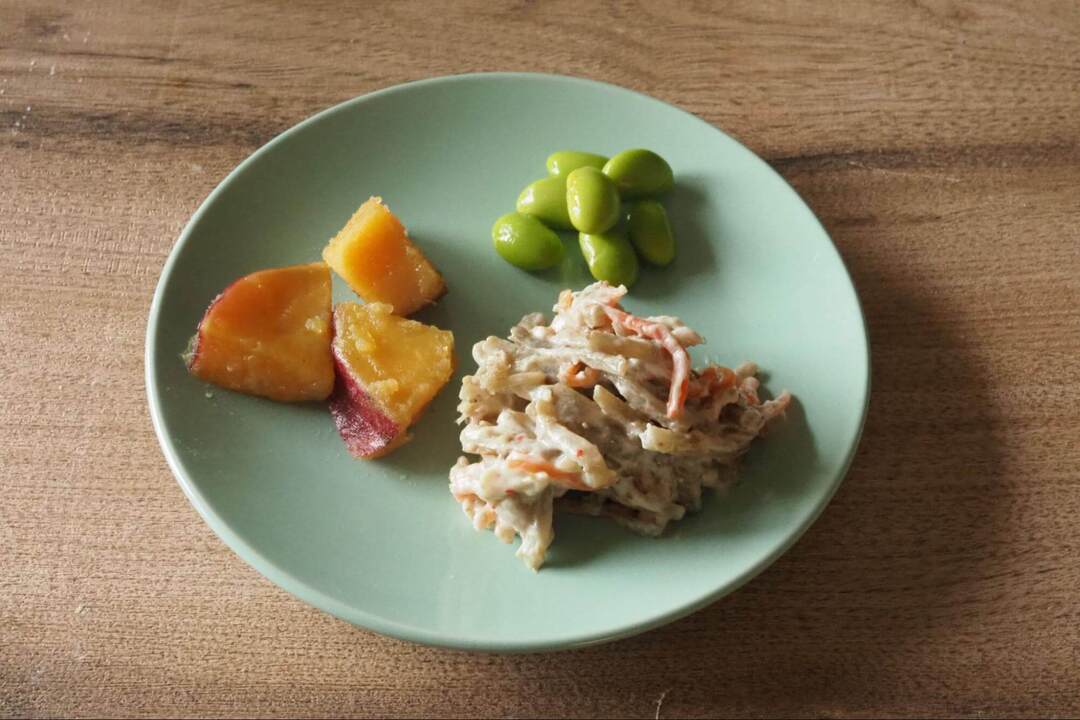 このごぼうサラダはごぼうがやわらかく、噛み切りやすい!そして商品名にあるようにごまの風味が効いている味付けでクリーミー。子どもも食べやすい味です。1袋の半分弱(30g程度)を1食分(56kcal)にしました。
