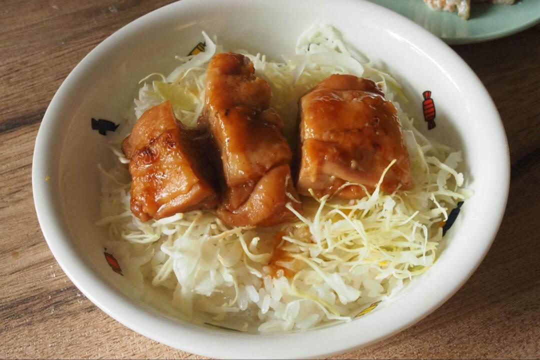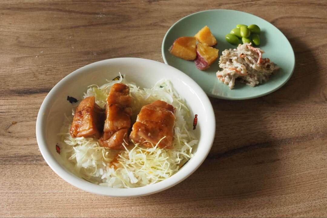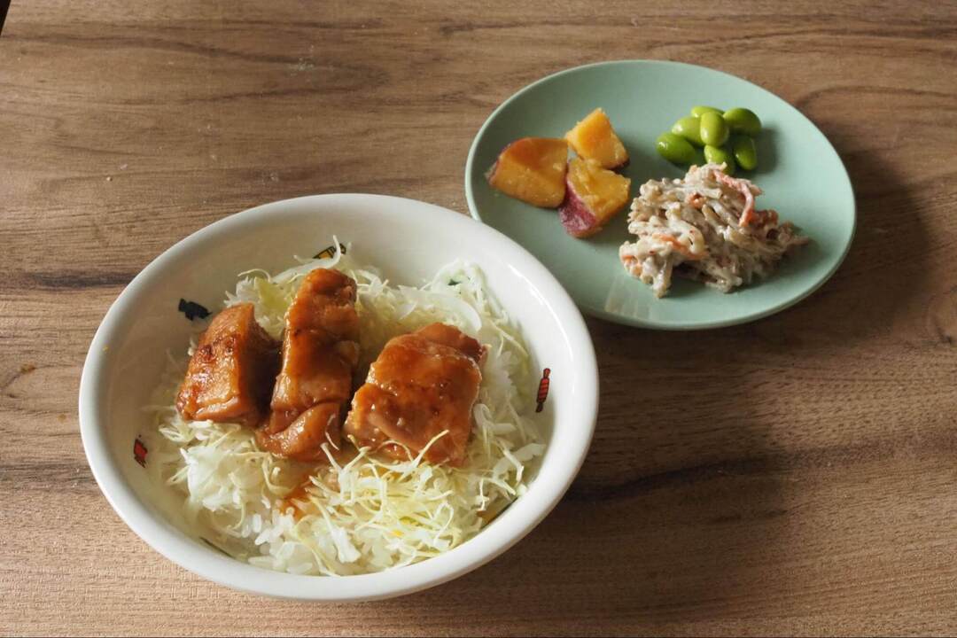 甘めのたれが肉にたっぷり絡みついているので、ご飯だけでなく野菜も一緒に食べられそう!千切りキャベツも一緒にご飯にのせました。