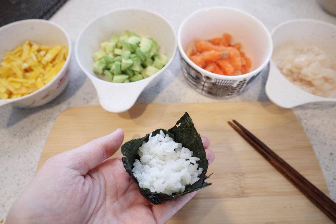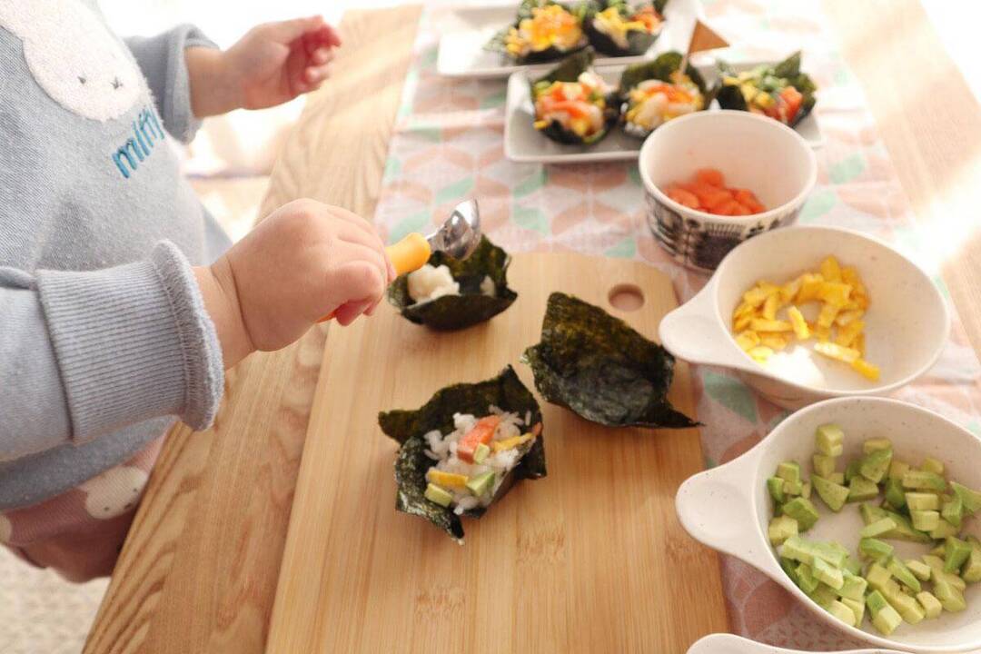 海苔カップに酢飯と具材を入れる作業が楽しいのか、好物だけでなくアボカドやスナップエンドウも、どんどんのせていました。