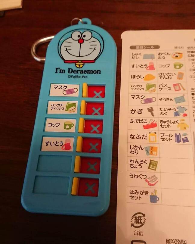なんと、ドラえもんのイラストが付いた忘れ物チェッカーも!こちらは西松屋で発見したのだとか。キャラクターが付いていると子どもも楽しく準備ができそうですね♡ キーホルダーでランドセルにもつけられるので安心!