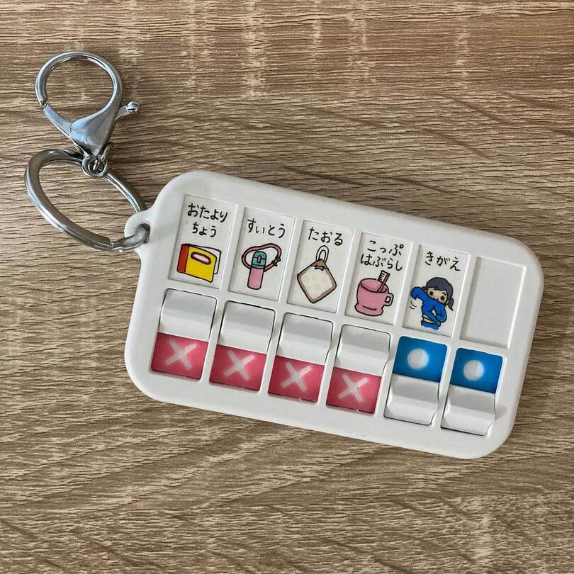 こちらは○と×のスライド部分が他の忘れ物チェッカーと少し違うデザインでキュート。 バッグに付けておくとチェックを忘れてしまうことがあるので、ドアにぶら下げてお出かけ前に持ち物を確認しているんだそう。