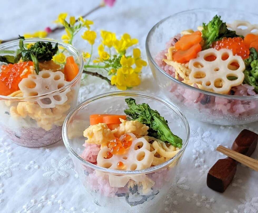 こちらは子どもたちと一緒に作ったというカップ寿司。ガラスの器に自分好みにきれいに盛り付けるのは、小さな子どもでも楽しめそうですね。透明容器で横から見てもカラフルになるように、黒米で色付けしたピンク色の酢飯を使用。