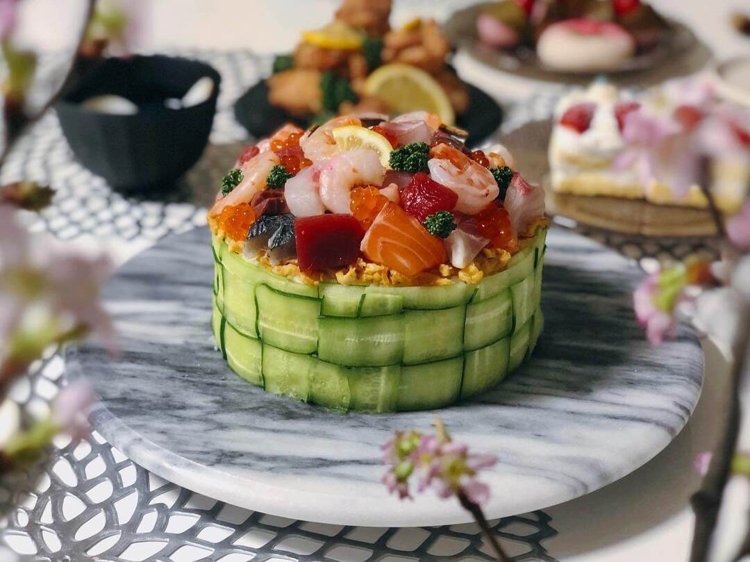 縦にスライスしたキュウリを格子状に編み込んで、スウェーデンのサンドイッチケーキ「スモーガストルタ」にも見えるカラフルなお寿司ケーキに。