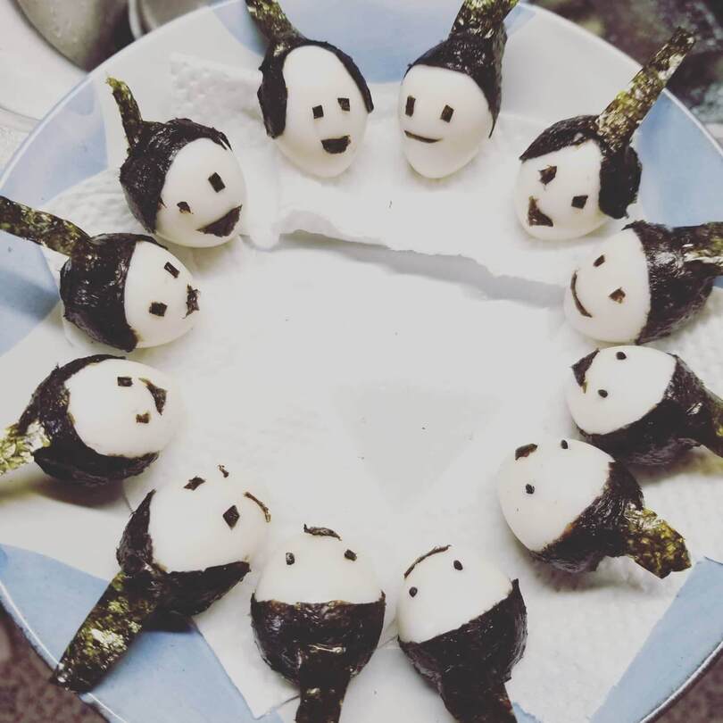 つるつるのうずら卵に海苔の冠をかぶせたり顔を作ったりするのは大変だったそうですが、色白細面のすてきな平安美男子たちが完成!