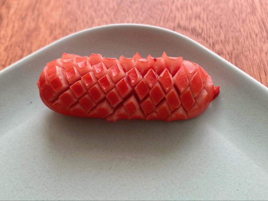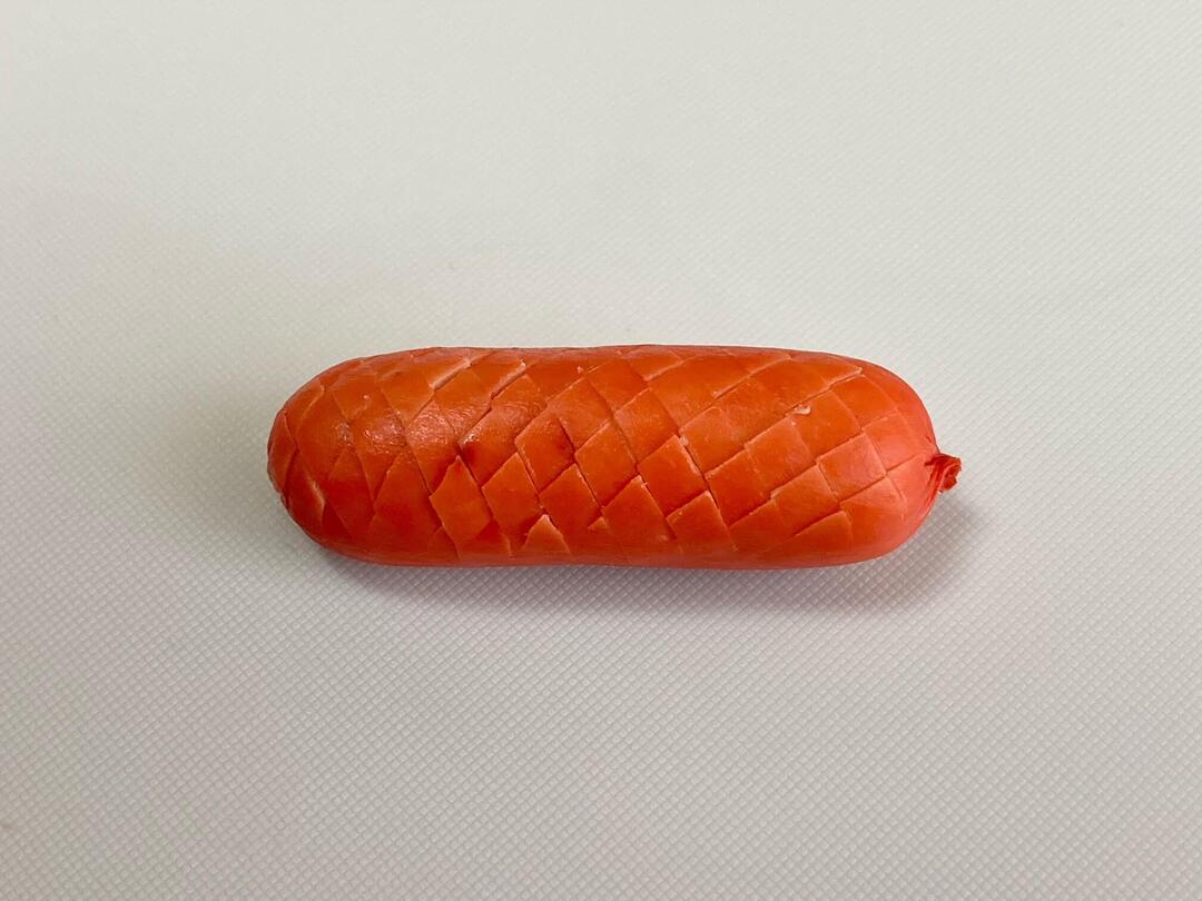 ウインナーに斜めに2〜3ミリ間隔で格子状の切り込みを入れます。
