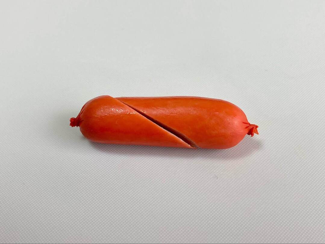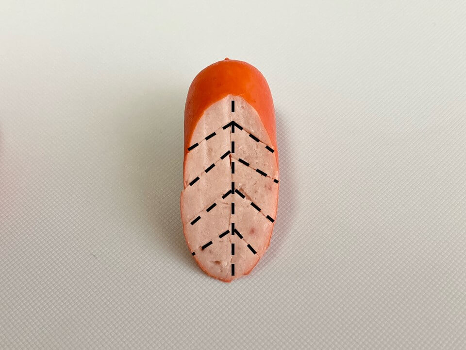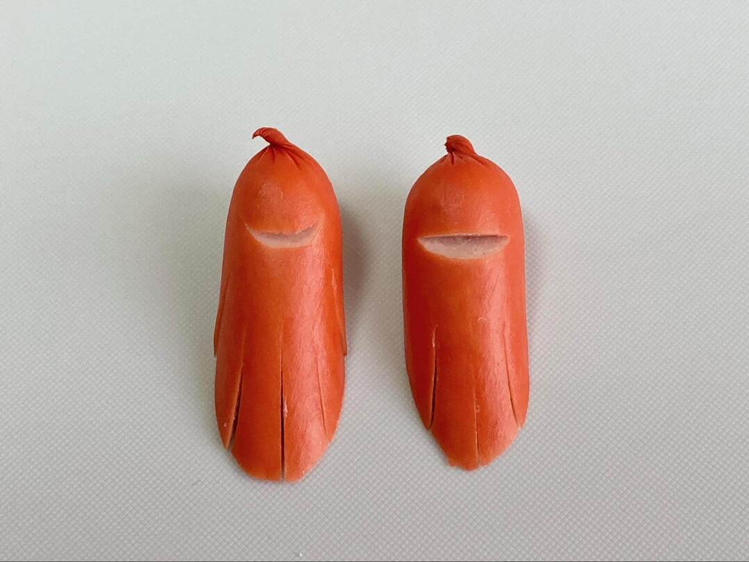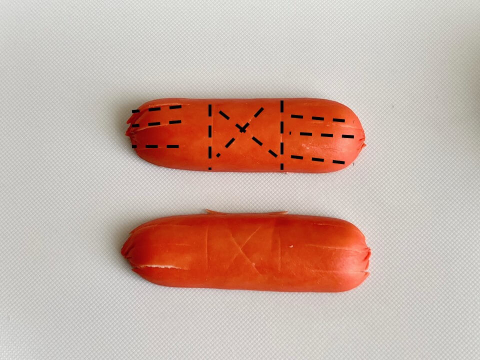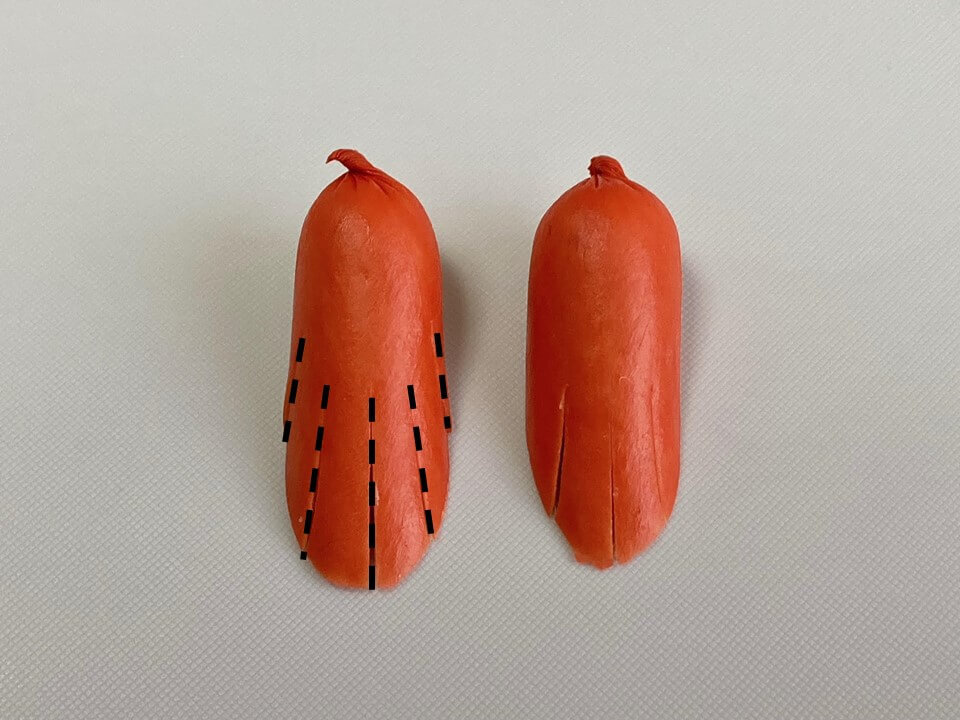 写真の下のウインナーのように上部に少しだけ切り込みを入れると、目を作ることができます!