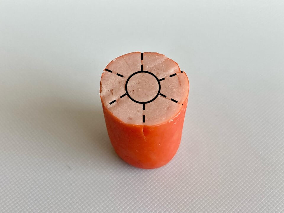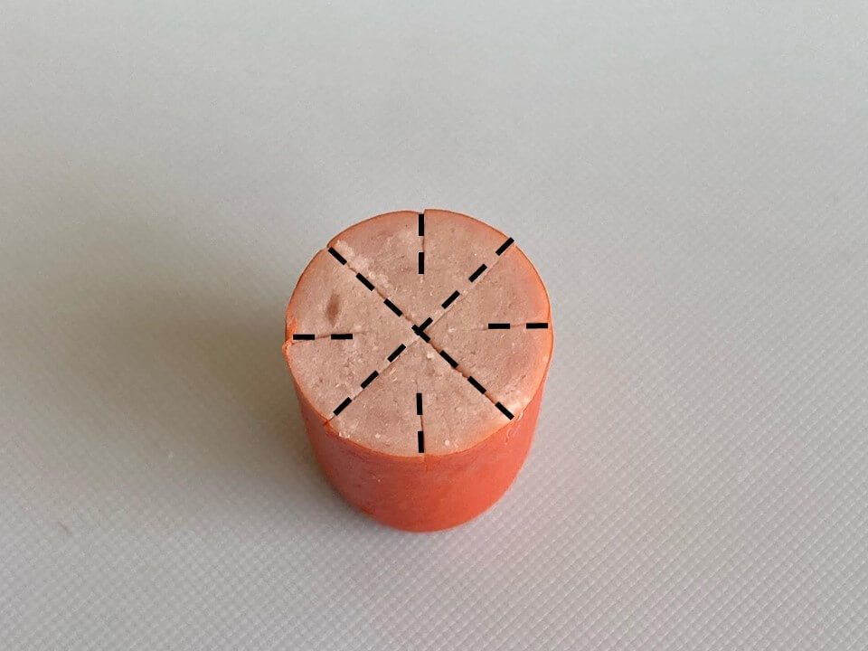 断面に十字に切り込みを入れ、さらに切った部分が半分になるように、外側から4か所に切り込みを入れます。