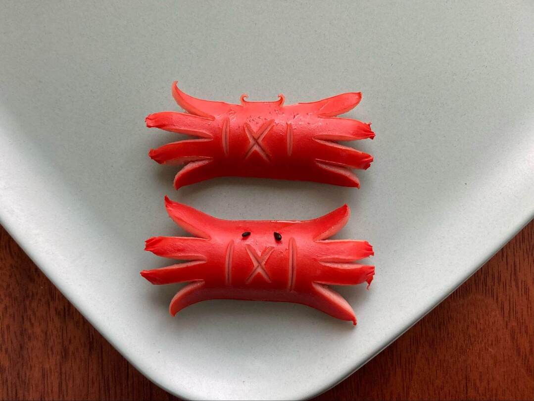 カニもウインナーの飾り切りの定番ですが、紹介するのは厚みを半分にした薄く食べやすい切り方です。