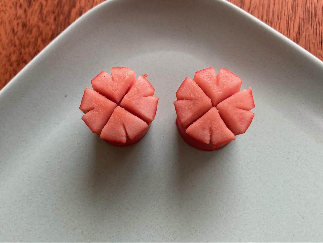 花びらに囲まれた、真ん中の丸い部分がポイント!ウインナー1本で2個できるので、一つをクローバー、もう1つをお花にするのもいいですね。