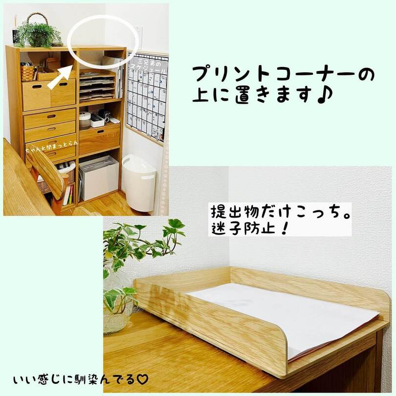 さらにシェルフの上に別のトレーを設置。提出する必要があるプリントはここに入れるルールに。