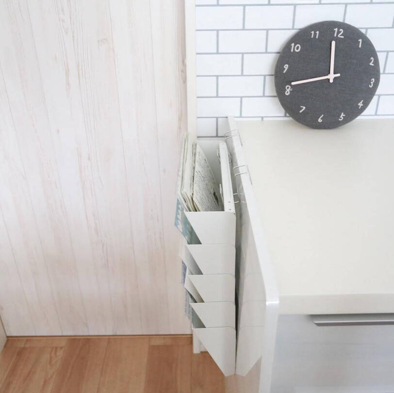 YUKIKOさんは、カップボード横に無印良品の「ステンレス扉につけるフック」を使ってIKEAの新聞ラックを設置。プリントをしっかりと管理するために、家族みんなの目につきやすい場所に置き場をつくるのがポイントです。