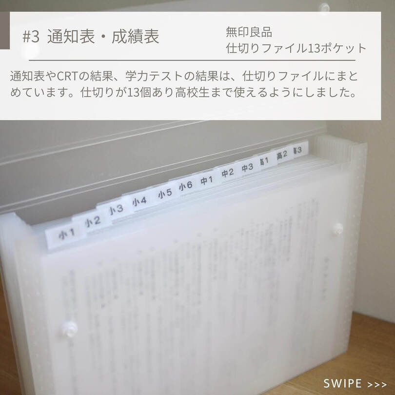 通知表や学力検査の結果など、長期間保管しておくものは無印良品の「ポリプロピレン仕切りファイル」に。13ポケットのタイプを使っているので、学年ごとにすれば高校生までこのファイル1冊で済んでしまうのだとか!先々のことまで完璧な収納ですね☆