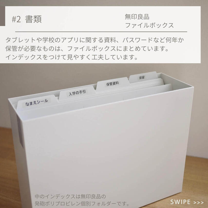 学校で受け取ったタブレットの取り扱いルールやパスワード類など、年間通じて保管が必要なものはインデックスをつけて無印良品のファイルボックスに保管。