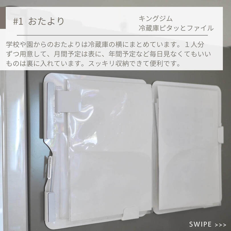 日常的なおたよりなどのプリントは、冷蔵庫にくっつくファイルに保管。毎日見なくてよいものは裏側に、月間予定表などの日常的に見たいものは表側に入れているそう。