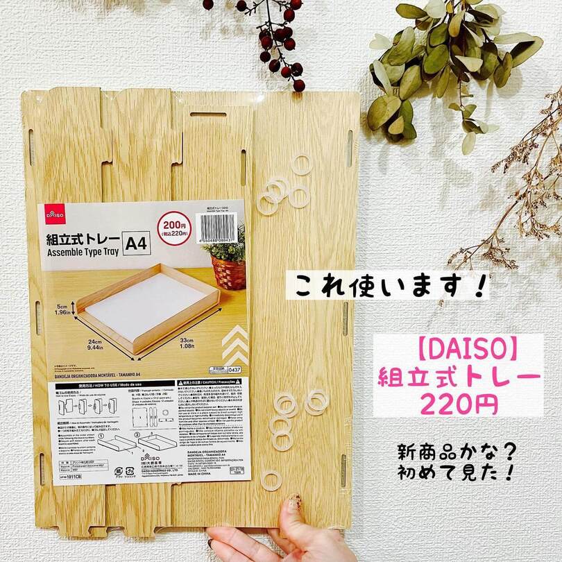 使用しているのはダイソーの組み立て式トレー(220円・税込)で、ナチュラルな木目デザインが部屋のインテリアに馴染んでいますね。